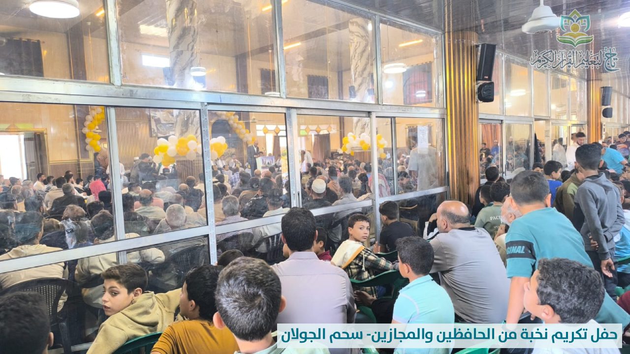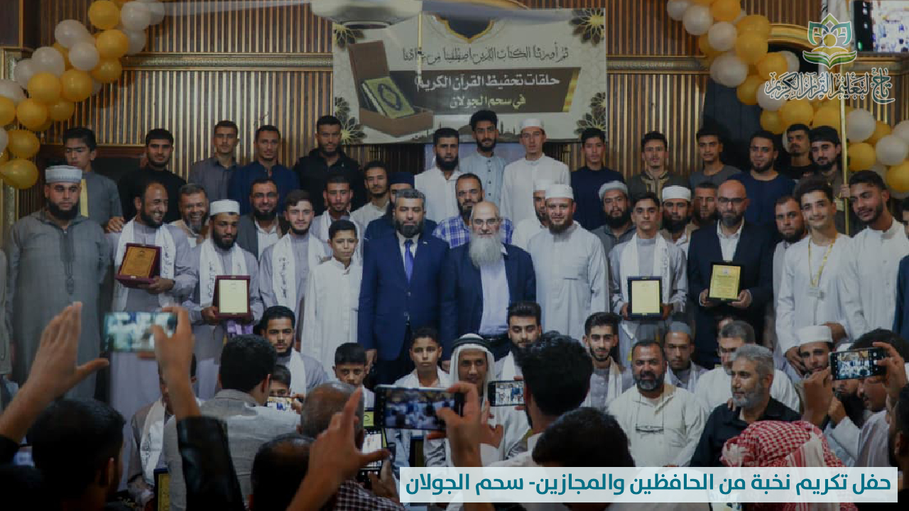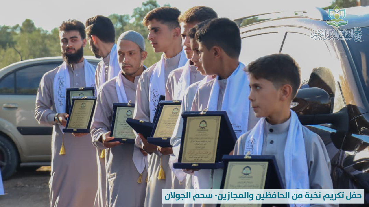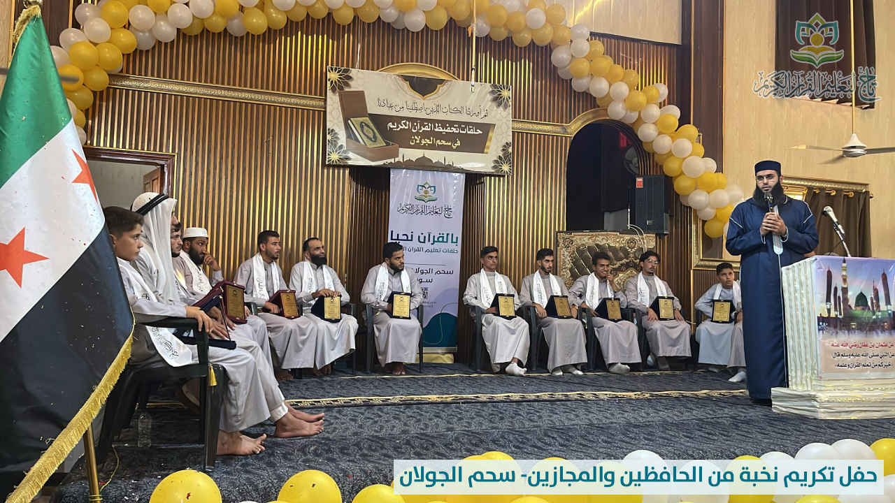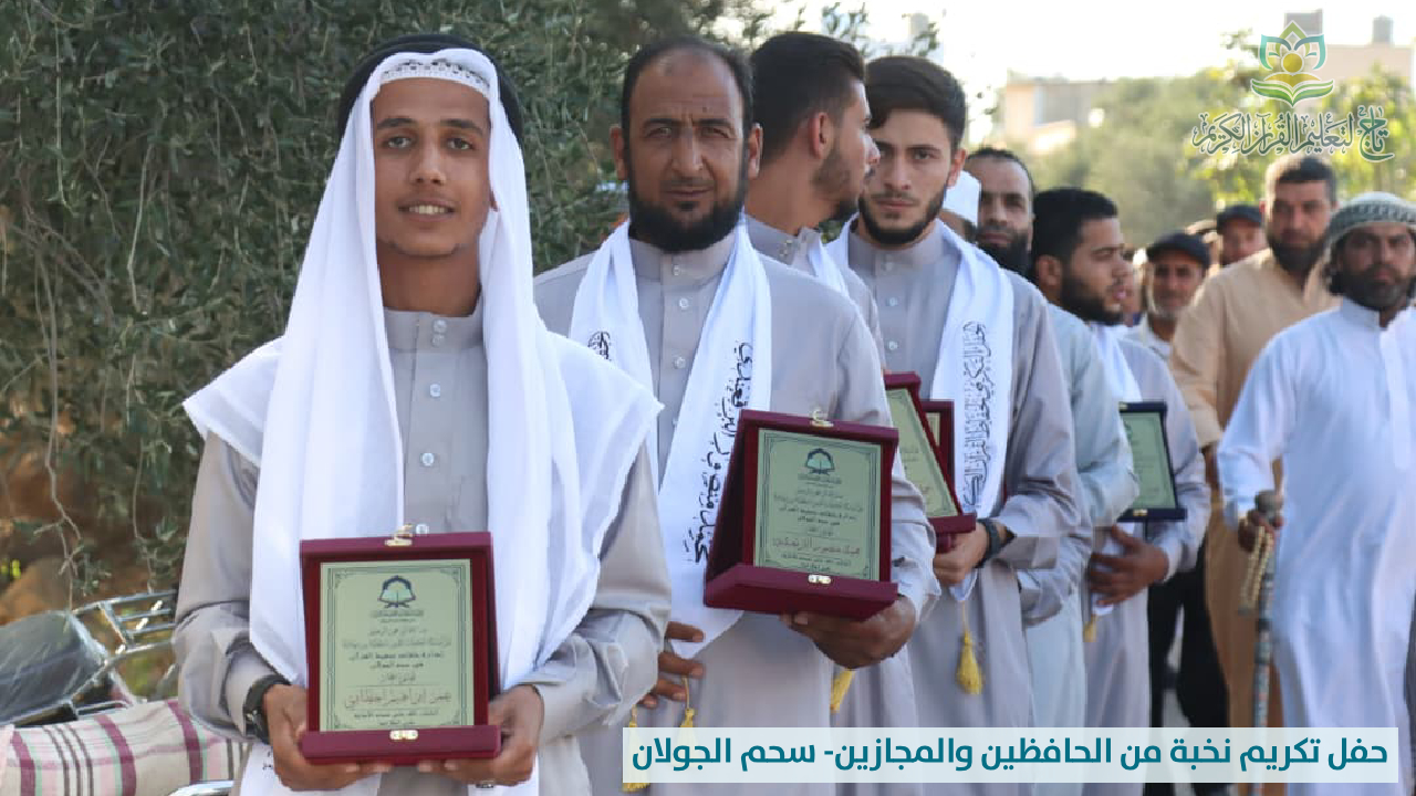 أقامت مؤسسة تاج لتعليم القرآن الكريم، وبإشراف مديرية الأوقاف في درعا "حفل تكريم نخبة من الحافظين والمجازين" في بلدة سحم الجولان، وذلك يوم الأحد 12 أكتوبر 2025م في المسجد الشمالي.